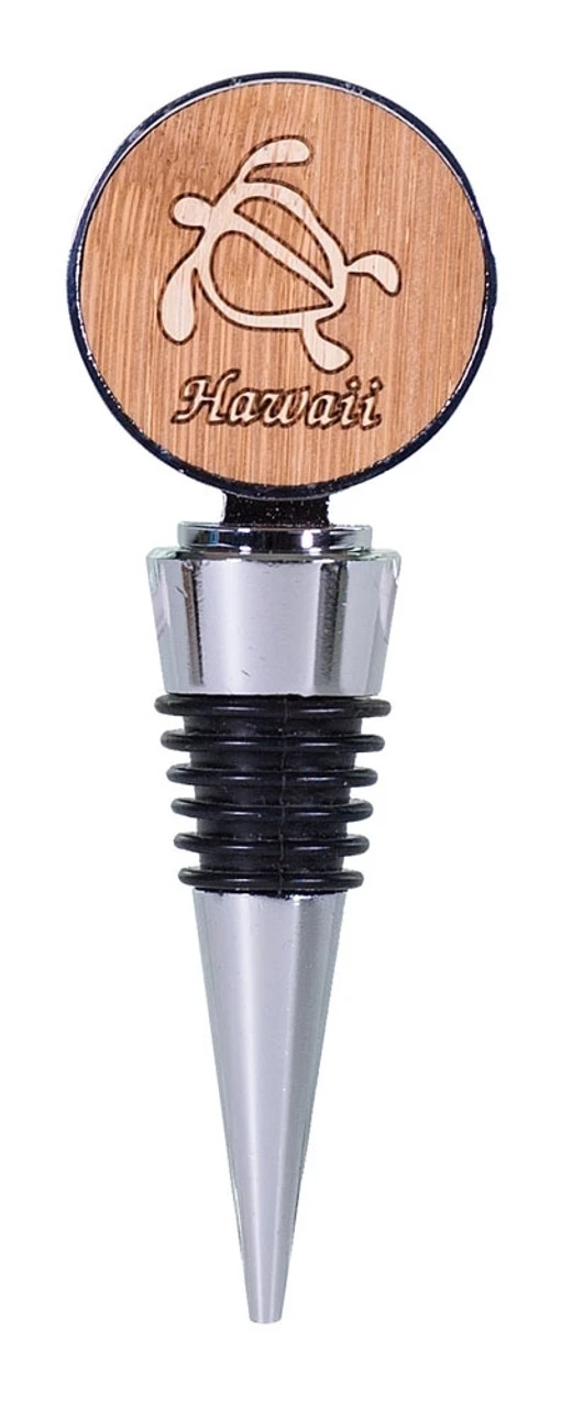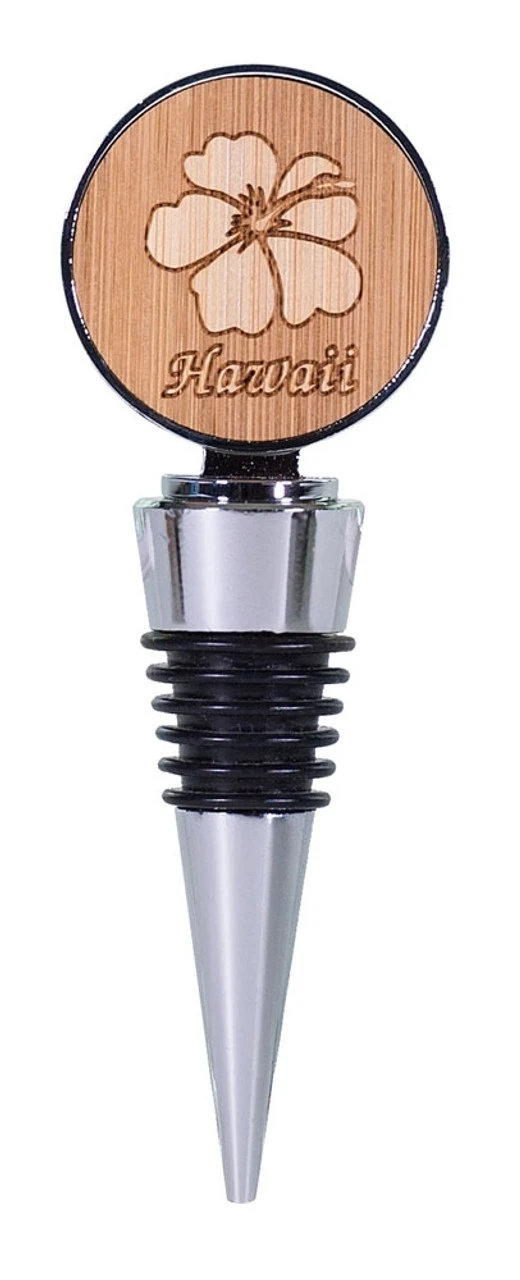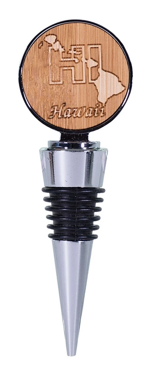 It features a Hawaiian Design etched onto bamboo and has rubber stopper rings to keep wine fresh.