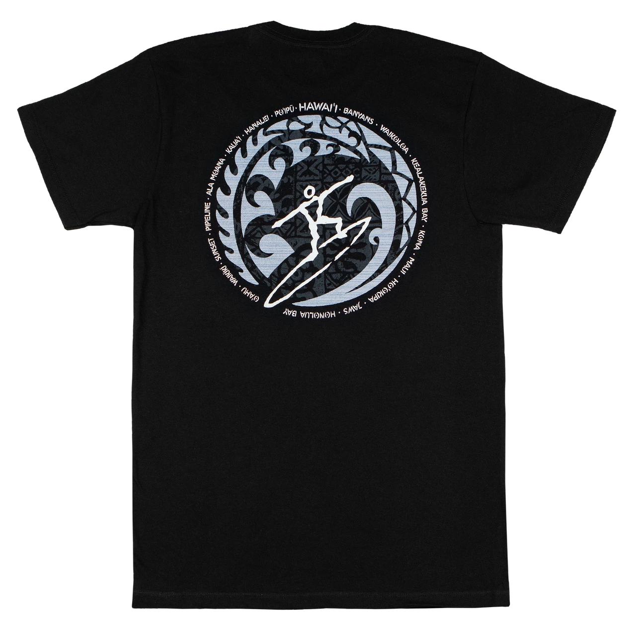 This design features a petroglyph inspired surfer while showcasing some of Hawaii’s most famous and wellknown wave riding beaches.