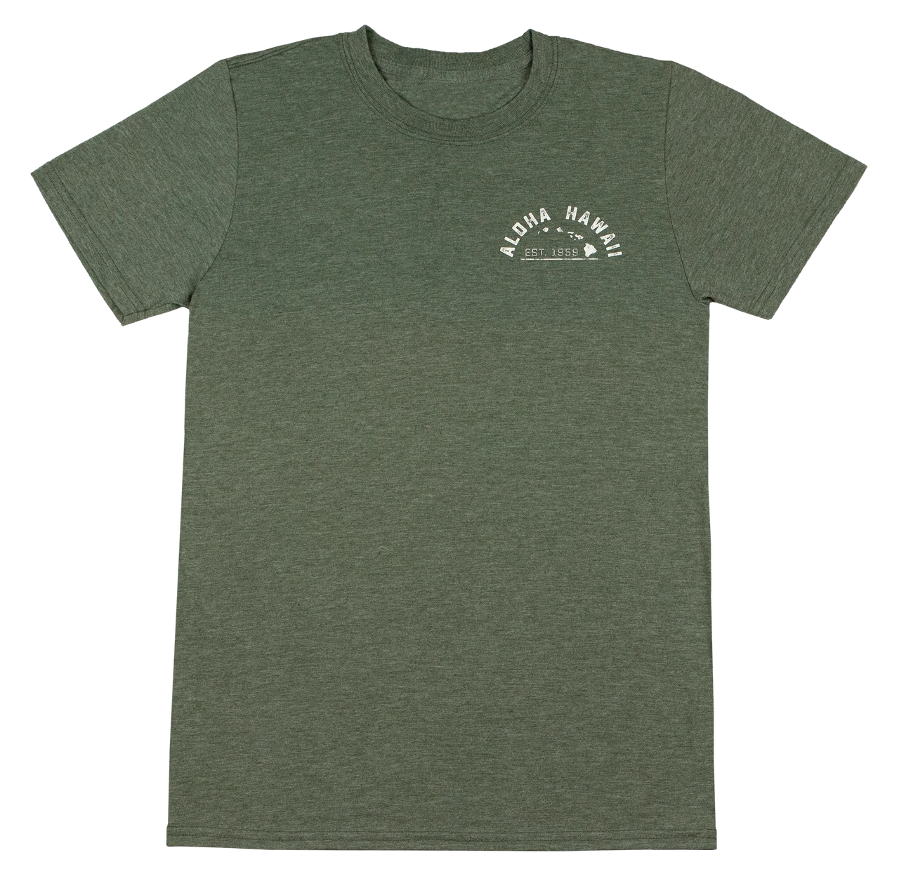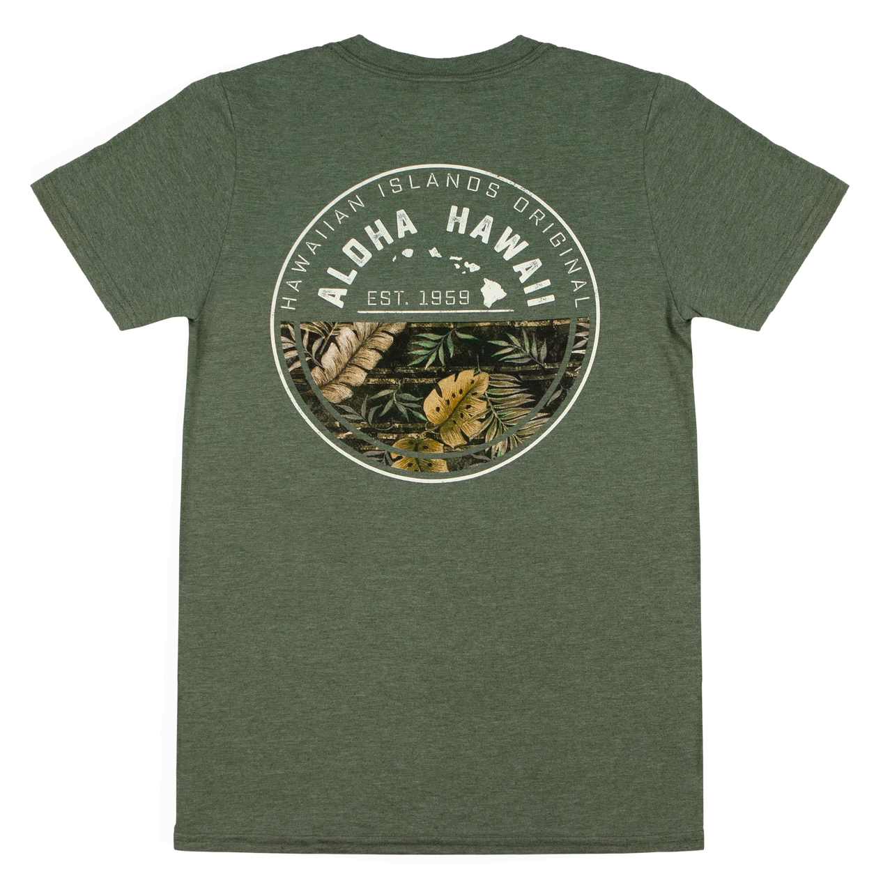 This iconic print features the Hawaiian Islands along with tropical rainforest imagery.