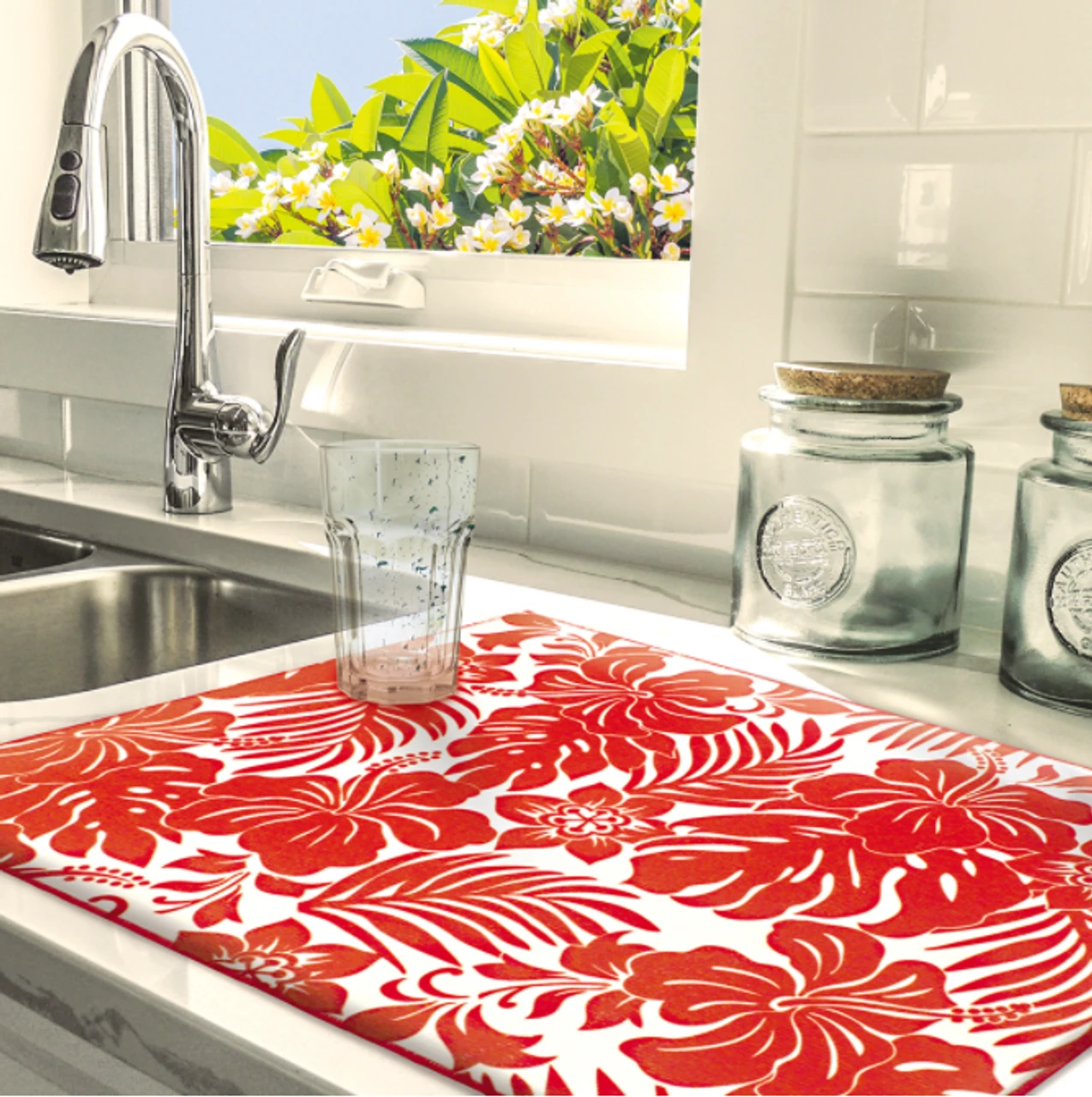 Microfiber drying mats add practical, vibrant island flair to any kitchen. Drying mats are machine washable, gentle cycle and tumble dry low heat.