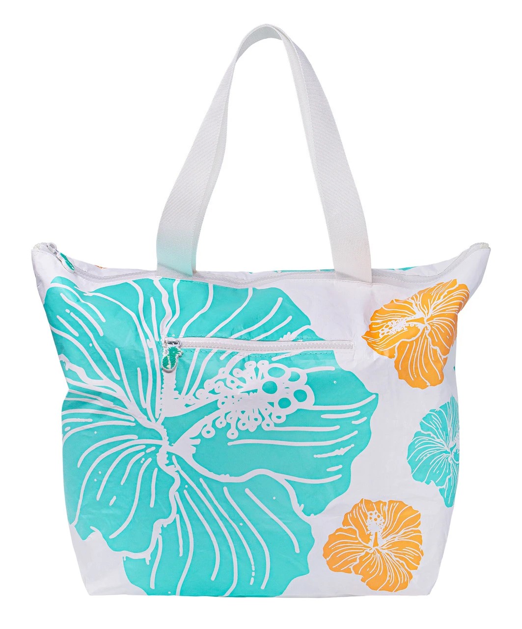 Hawaii Loa Tyvek Water Resistant Tote Bag: White and Turquoise Hibiscus