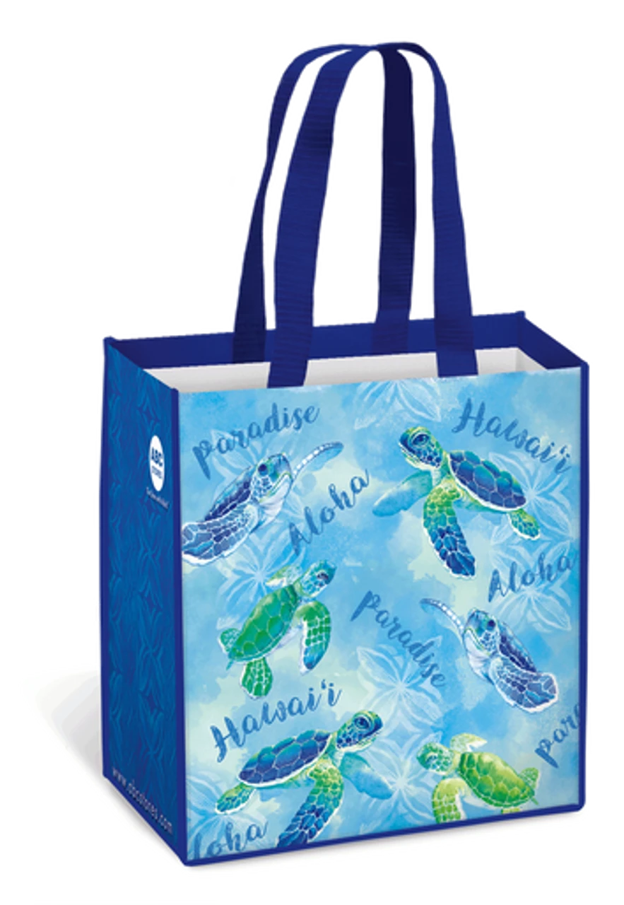 Hawaii-themed reusable bags with bottom support board. Made with durable polypropylene.