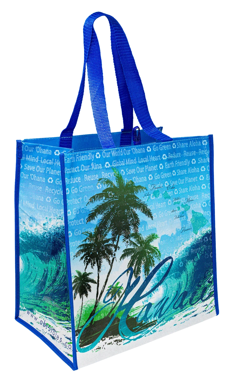 Hawaii-themed reusable bags with bottom support board. Made with durable polypropylene.
