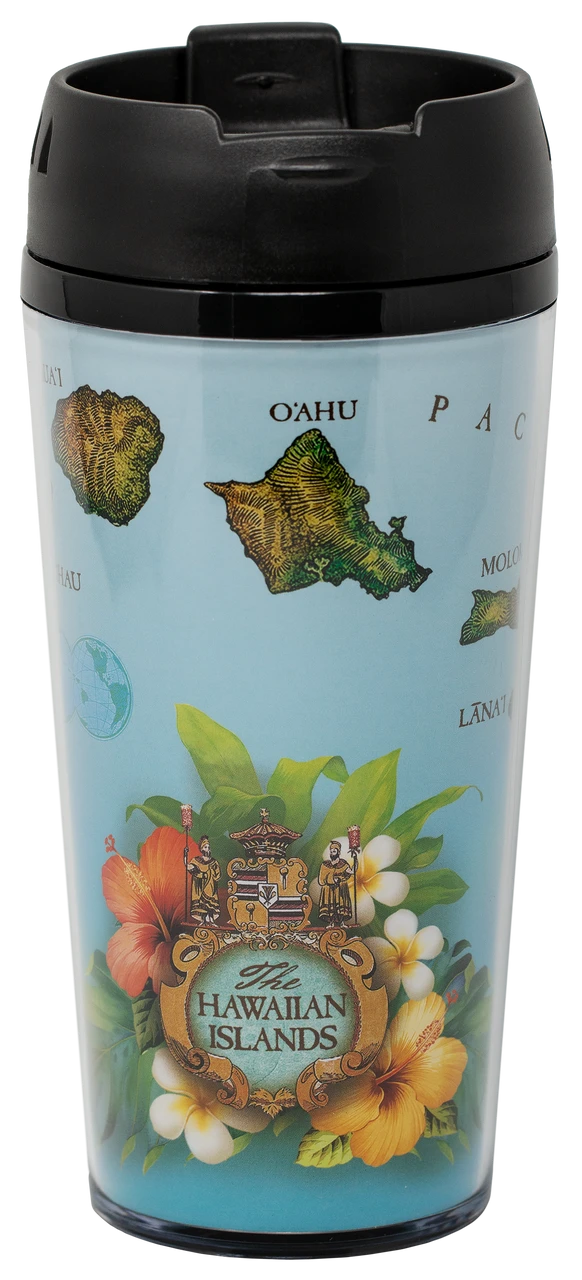 16oz travel mugs with Hawaii inspired designs and adouble-wall cavity to maintain temperature of any beverage. Twist lid with a locking tab to prevent spills.