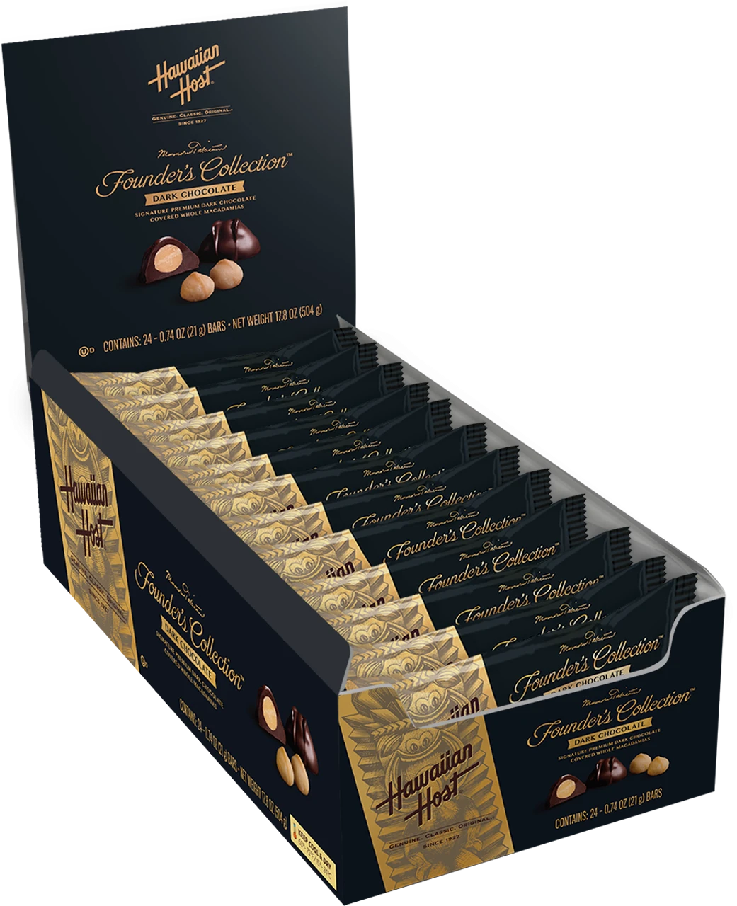 A carton of 24 Hawaiian Host snack bars (.72 oz), each containing 2 pieces of savory whole macadamia nuts enrobed in mouth watering premium dark chocolate.