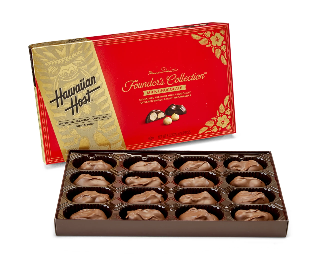 Hawaiian Host’s famous chocolate-covered macadamia nuts are a treasured gift-giving tradition throughout the Islands. Premium whole double-roasted macadamias are hand-selected and covered in their secret recipe of rich milk chocolate.