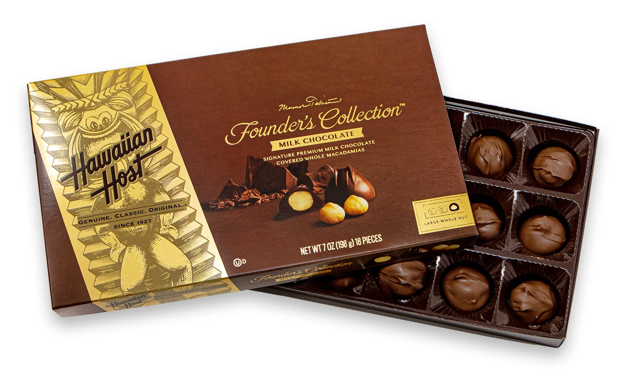 Hawaiian Host’s famous chocolate-covered macadamia nuts are a treasured gift-giving tradition throughout the Islands. Premium whole double-roasted macadamias are hand-selected and covered in their secret recipe of rich milk chocolate.