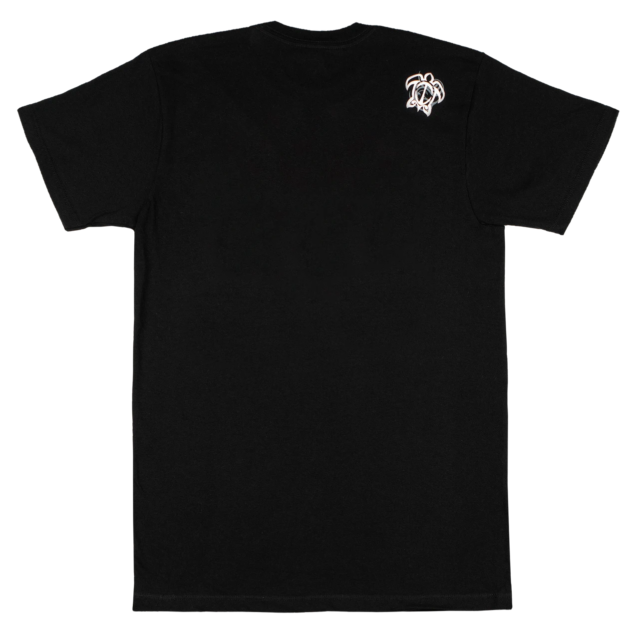 Large print on front left with a small honu design on back right shoulder.