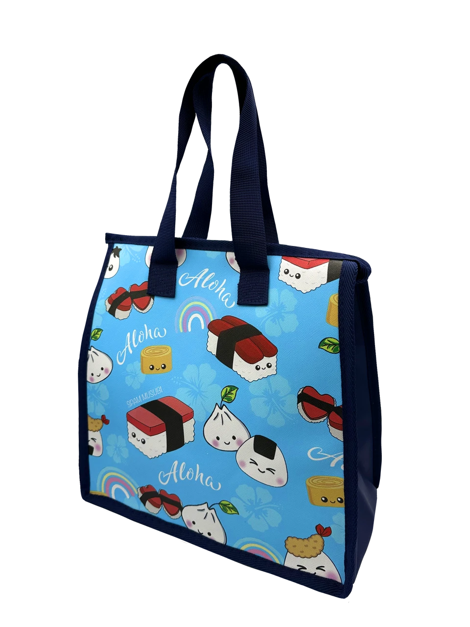 This insulated lunch bag made of PU leather has a nylon handle with zipper closure, and is lined with aluminum foil that has a 6” gusset to accommodate larger containers. The waterproof material makes it very easy to wipe down and clean.