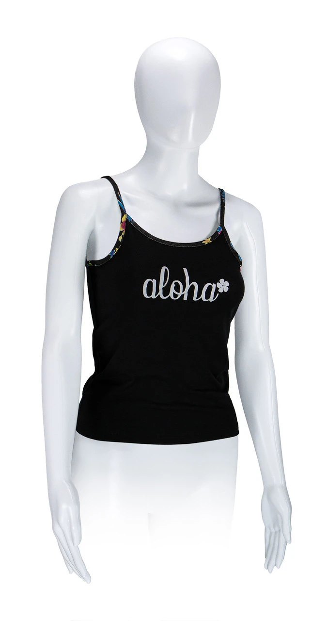 Strap tee with Hawaiian printed trim that is form fitting for flattery and contoured to accentuate!