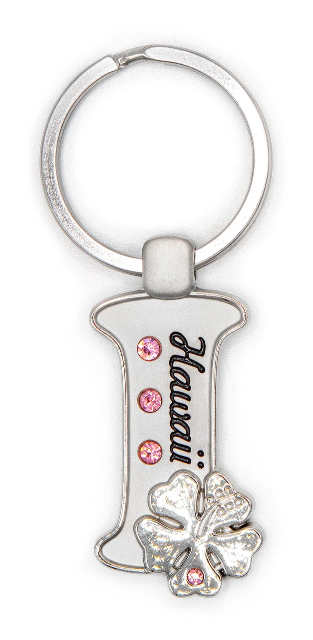 Matte metal keyring adorned with pretty stones and a hibiscus flower.