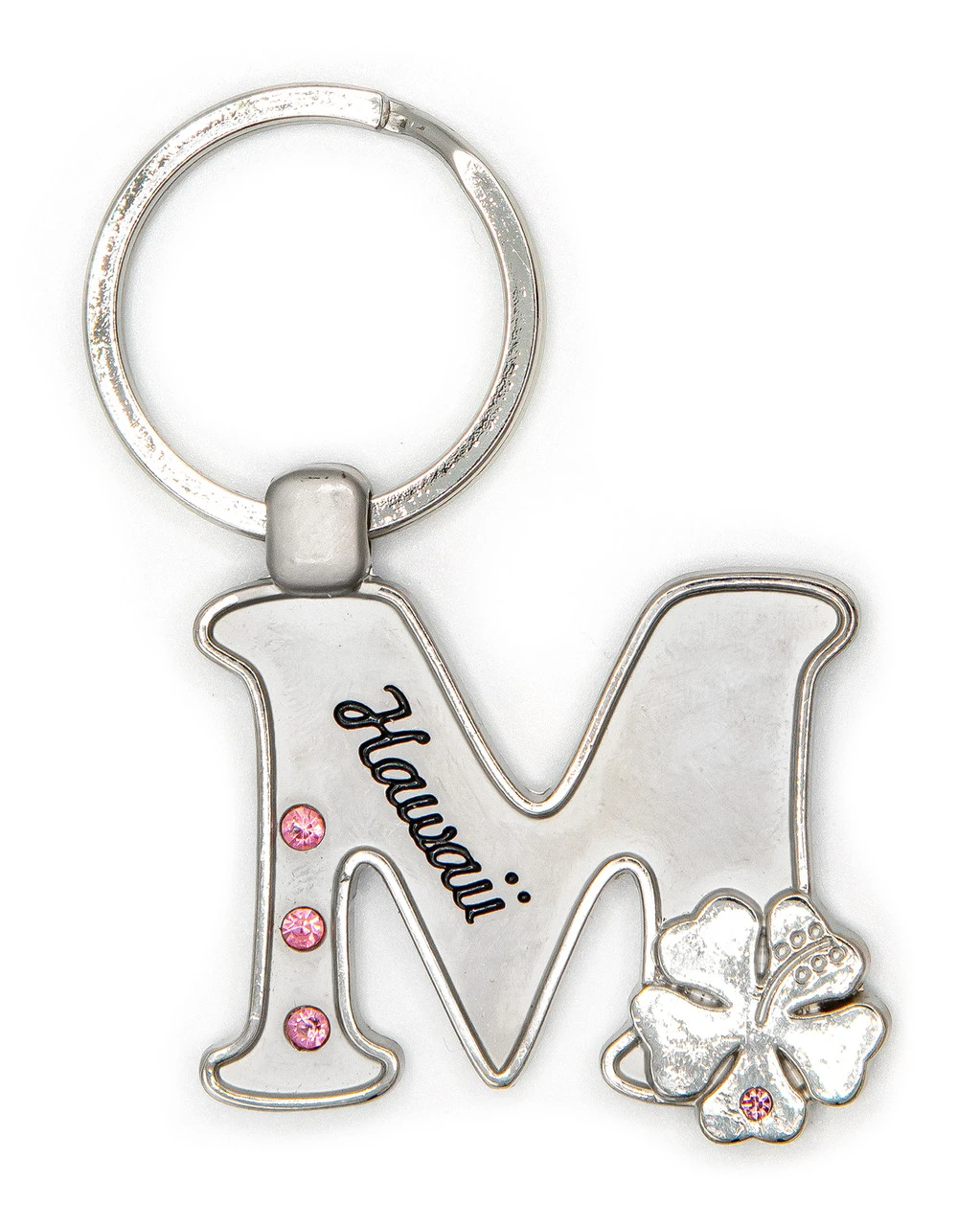 Matte metal keyring adorned with pretty stones and a hibiscus flower.