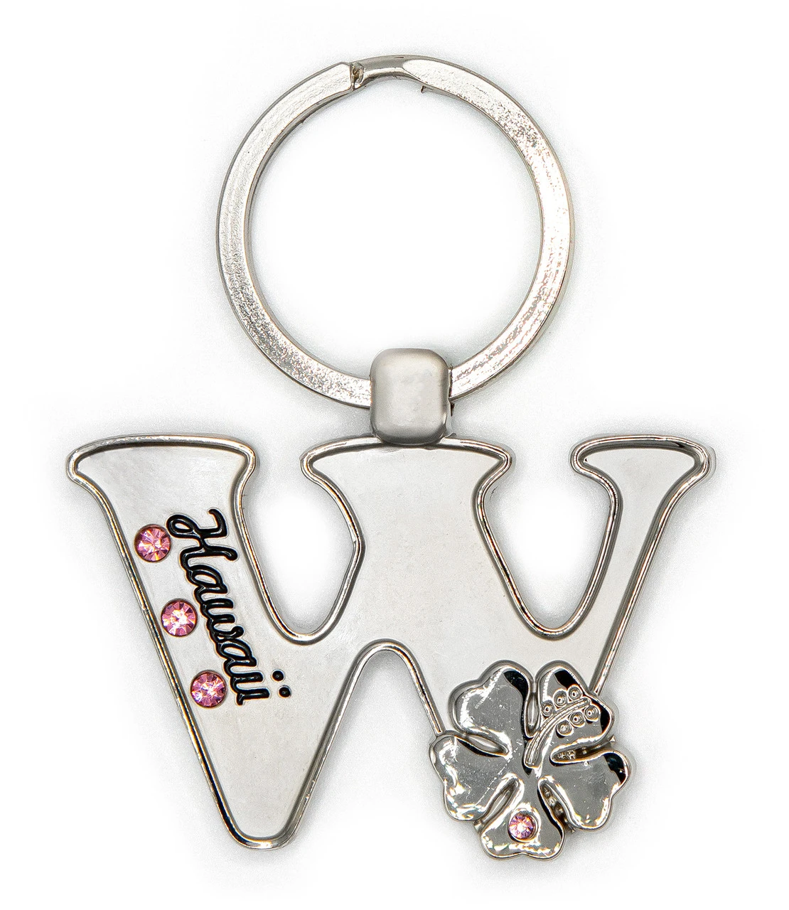 Matte metal keyring adorned with pretty stones and a hibiscus flower.