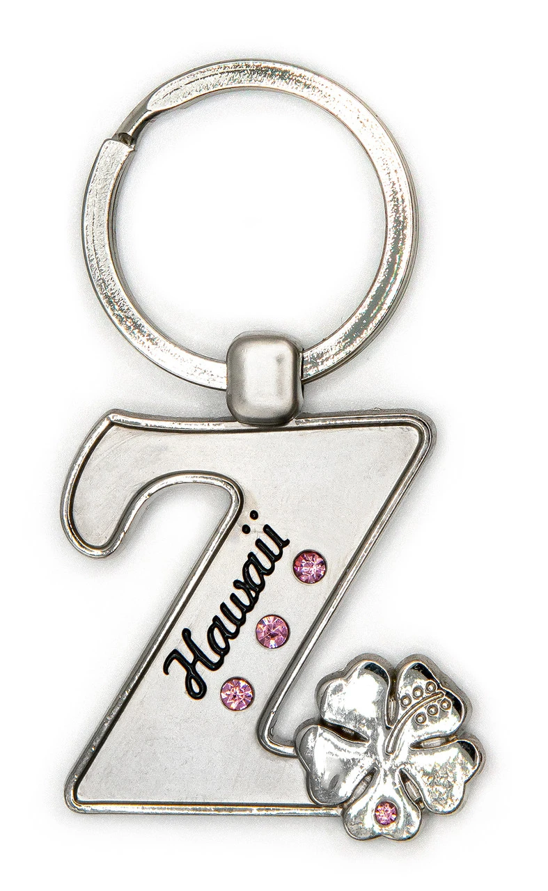 Matte metal keyring adorned with pretty stones and a hibiscus flower.