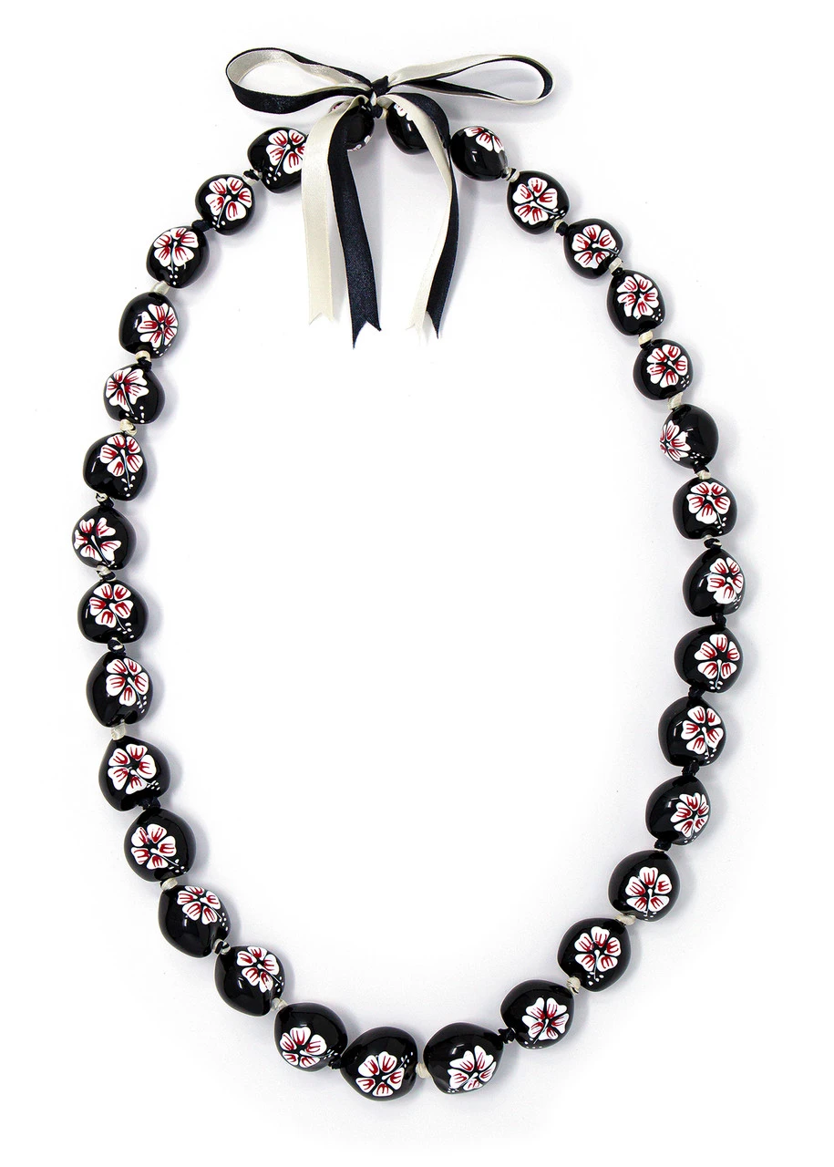 Made from 32 genuine Kukui Nuts, each lei measures approximately 38 inches in length with a colorful and adjustable ribbon tie. Each kukui nut is smoothed and polished to perfection before having a hand-painted hibiscus flower added on two sides of each kukui. These colorful additions add a touch of flair and are great for more casual events. They may also be given as congratulatory gifts, or even used as accents to add some tropical fun to the home or office.