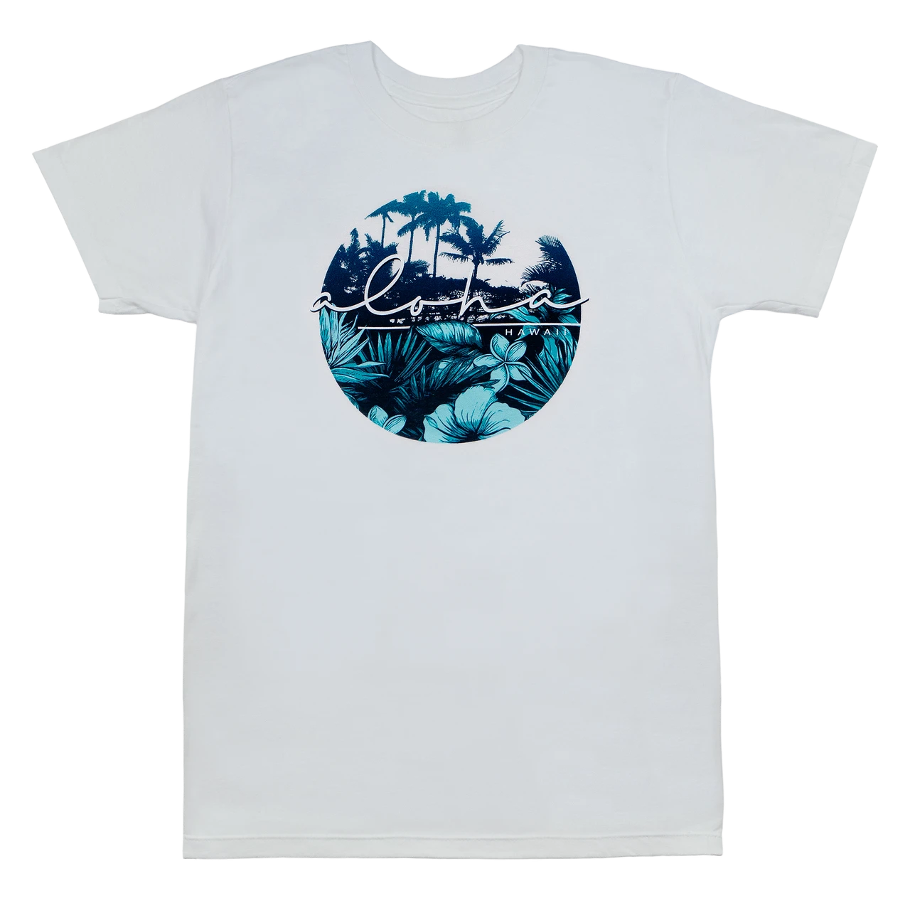 Aloha Hawaii tee with a scenic backdrop of palm trees and assorted hawaiian flowers.