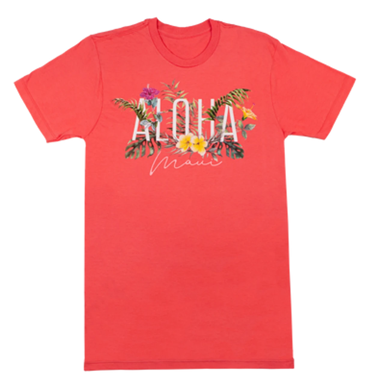 Garden Aloha Hawaii tee blooming with red and yellow hibiscus flowers and monstera fern leaves.