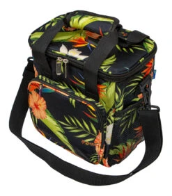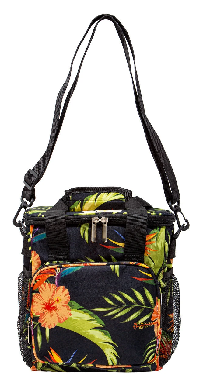 Collapsible cooler with a top flap with zip and grip closure which can fit up to 12 cans.