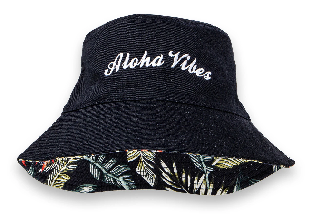 Fully reversible style with a plain Black with white “Aloha Vibes” text on one side, and a navy Birds of Paradise print on the other.