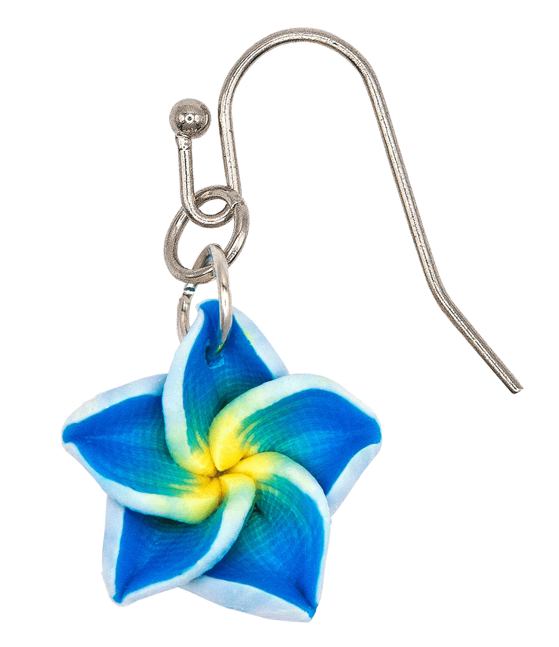 0.625″ plumeria blossom on pierced wire hook-style earrings.