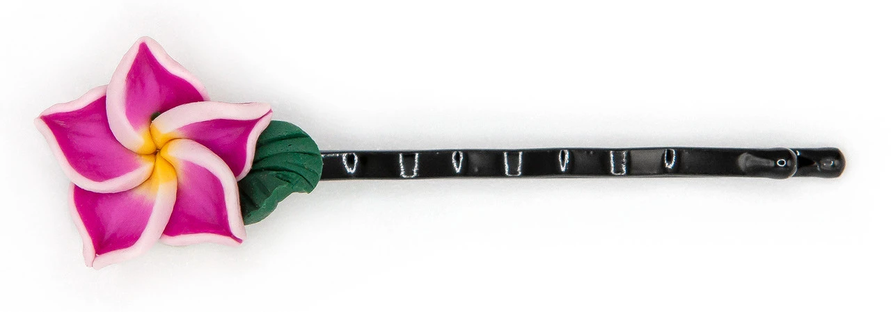 Pretty plumeria blossoms measure approximately 0.625″ in diameter – on a durable black bobby pin. Set of Two.