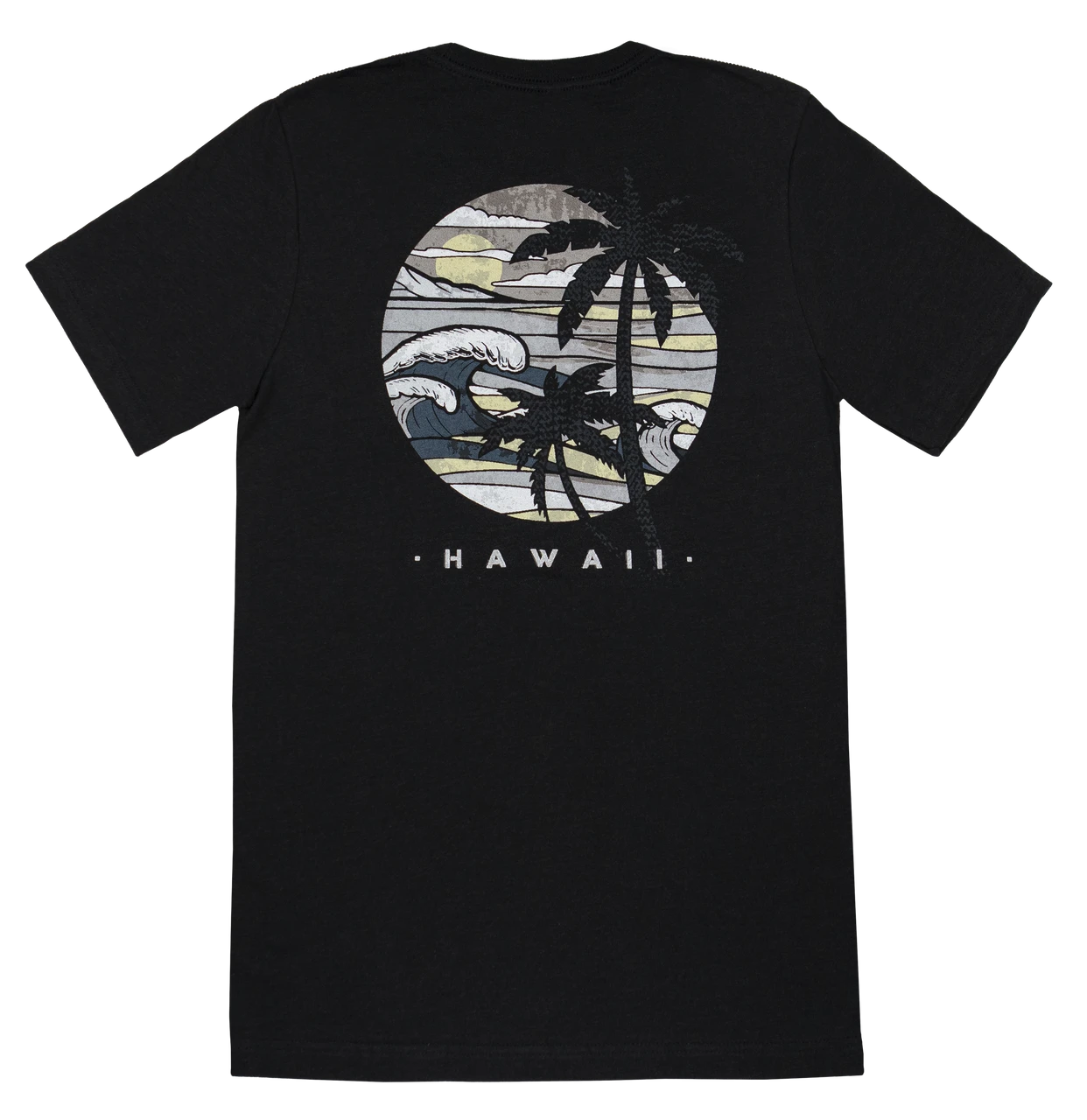 Stylized shorebreak background with idyllic palm tree silhouettes.